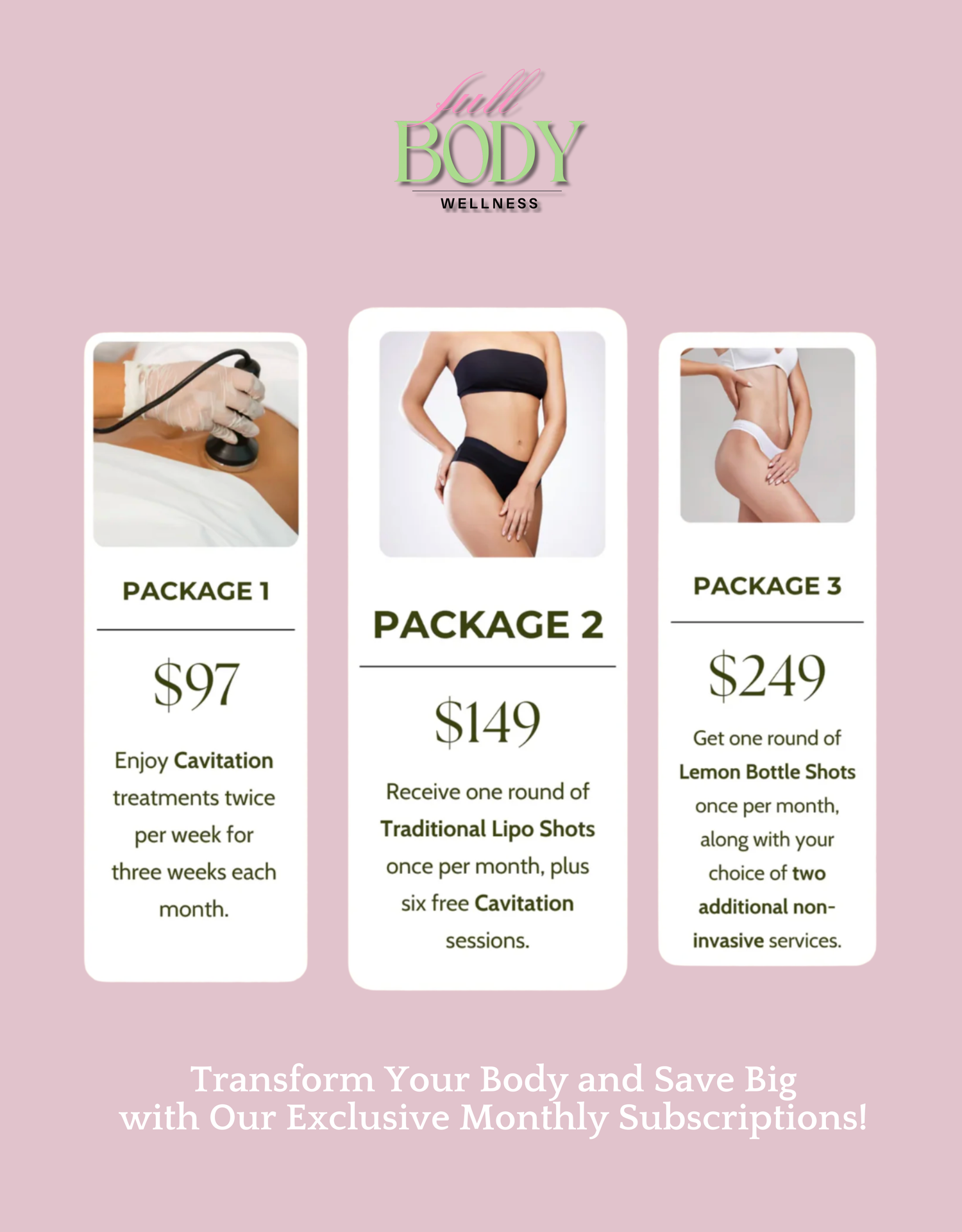 Choose from three body contouring packages tailored to your needs. For $97, enjoy twice-weekly cavitation treatments for targeted fat reduction. Upgrade to $149 for a combination of Lipo Shots and cavitation for more dramatic results. Or, customize your treatment with Lemon Bottle Shots and two additional non-invasive services for $249.